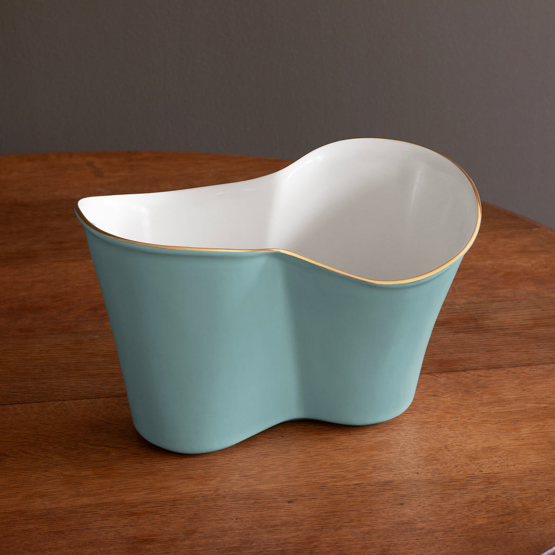 On trend, beautifully functional and wildly attractive, Beatriz Ball’s ENCANTO Double Ice Bucket (Turquoise and White) is a singular metal serving piece reminiscent of the best of contemporary art but utilizing practical materials for the ease of today’s busy lifestyles. The striking sculptural form is notable for its brilliant two-tone finish rimmed in gold, flaring shape, dramatic depth, and daring double form. Its generous figure-8 opening holds two bottles of wine. A great luxe piece with plenty of eye-appeal on the bar or kitchen island. Makes a fabulous gift for the wine lover, or anyone who loves to entertain in style. Beatriz Ball’s intensely handmade products use eco-friendly and sustainable materials and are crafted by artisans who trace a heritage of metalworking for generations. Made of a top quality, easy-care, aluminum alloy with an enamel finish. Dishwasher safe.