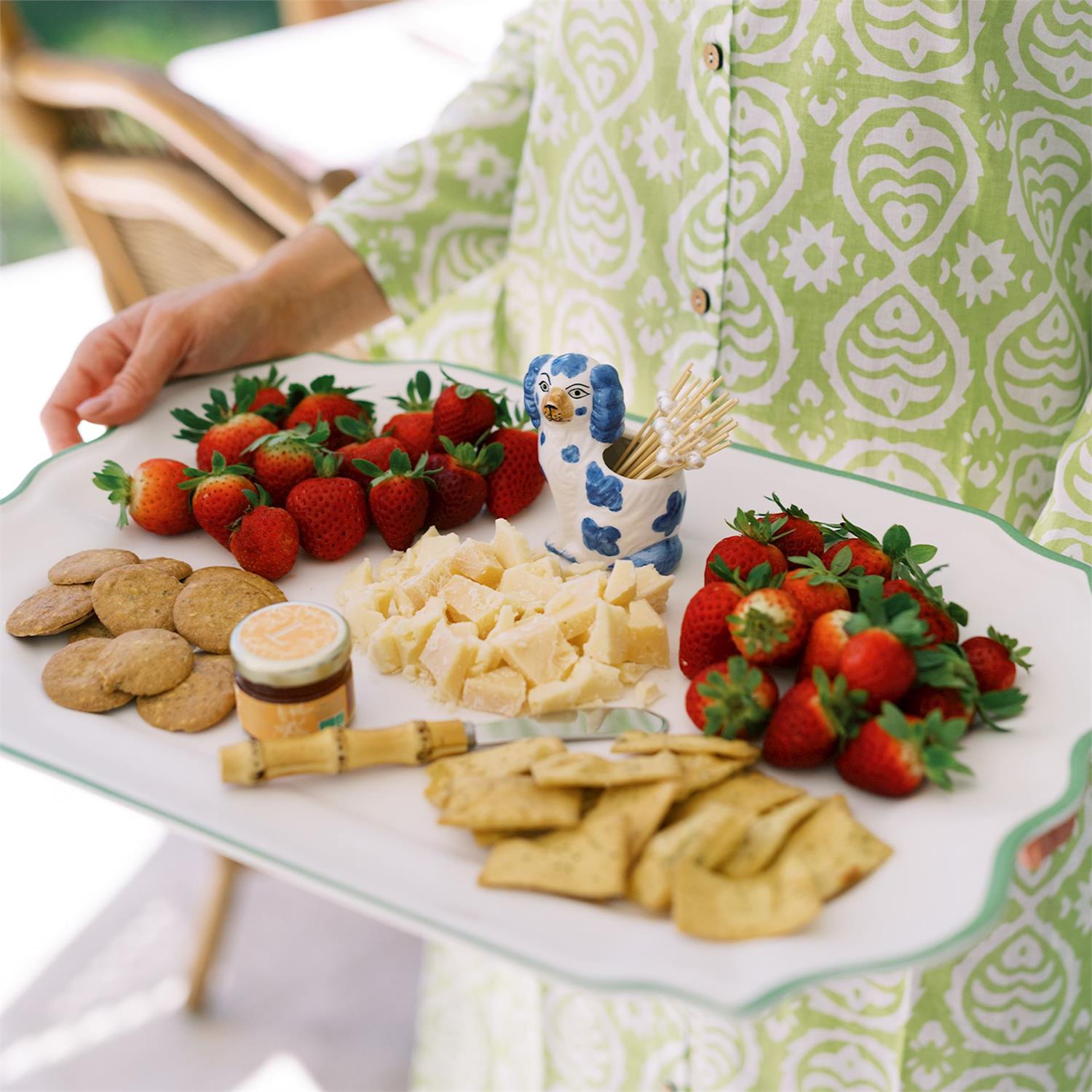 Your charcuterie board is just about to get a lot preppier!  We love this small Staffordshire style dog that comes complete with twenty pearl adorned bamboo picks.
