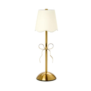 This charming cordless table lamp features a delicate bow-shaped design with a gold finish, adding a stylish accent to any space. Its rechargeable battery allows for convenient wireless use, and the stepless dimming lets you customize the brightness to your preference. The elegant fabric shade enhances the soft, ambient glow, making it a perfect lighting addition for any setting.