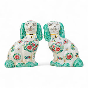 These hand painted rose medallion Staffordshire style spaniels are so elegant yet whimsical with their poppy color palette.