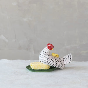 You know we love whimsy, so how could we not love this ceramic butter dish. This hen has two little chicks on top of her and is sitting atop a green base.