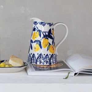 Sorrento vibes abound with this hand painted ceramic pitcher and its stunning blue and yellow lemon motif.