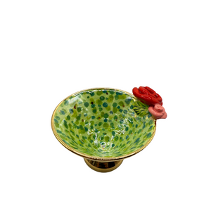A Candy Dish made by Mary Rose stands 2.5 inches high and is the perfect receptacle for whatever you choose!  These are accented with whimsical dots, dimensional roses and a leaf, and 24 carat gold.