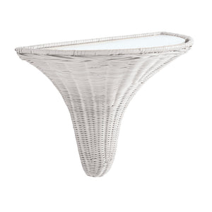 Amanda Lindroth designed this versatile wall bracket to create a stage for displaying a small piece of art, treasured shell or a flickering hurricane. The graceful trumpet shape is tightly hand woven of natural rattan around a smooth mahogany wood shelf.