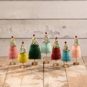 Cupcakes are everywhere, even in bottle brush! These mini green, red, blue, dark aqua, citrine, light pink, and hot pink trees are painted white on top to mimic icing and are finished with colorful glass beads and glitter with a perfectly placed red bead on top. Each tree has a natural wood base. Have fun sprinkling them in your holiday displays! Bottle brush with mdf base.
