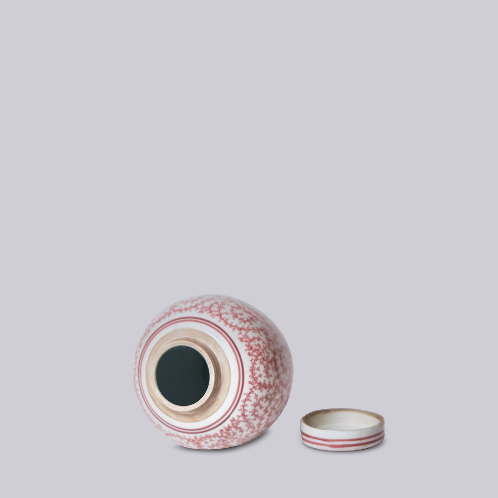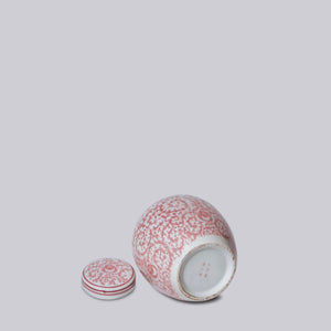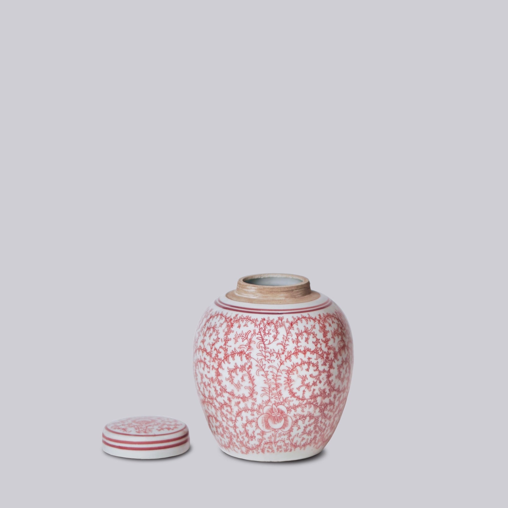 This is such a striking red and white porcelain jar in a chic scrolling peony motif.
