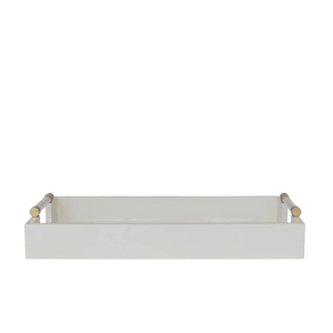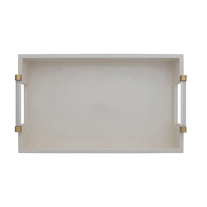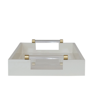 The Daniel tray is so chic with its sleek creamy white lacquered finish. It is accented with clear acrylic handles and brass details. It's perfect for a cocktail table or ottoman.