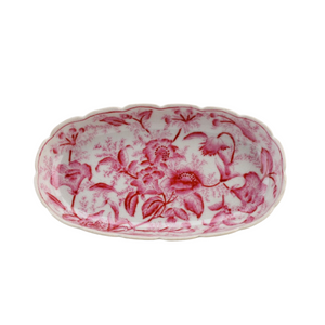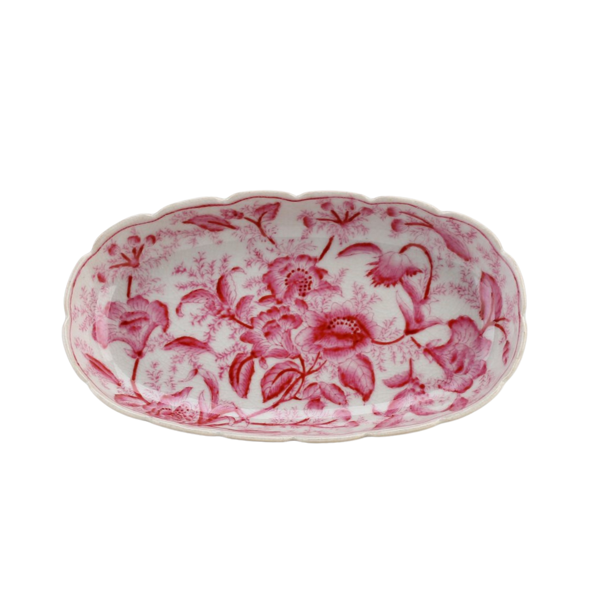 This primrose patterned pink and white porcelain dish is exquisite, and featured four ball feet. It's perfect to sit atop a cocktail table, or to stash jewelry on a dressing table.