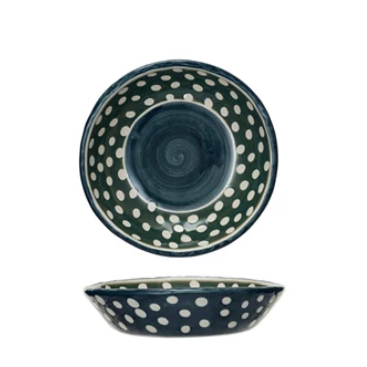 These handpainted stoneware bowls feature wax relieve dots and are perfect for trinkets or serving dips or queso!  Available in four colors, please expect subtle variances between pieces as each is hand painted.
