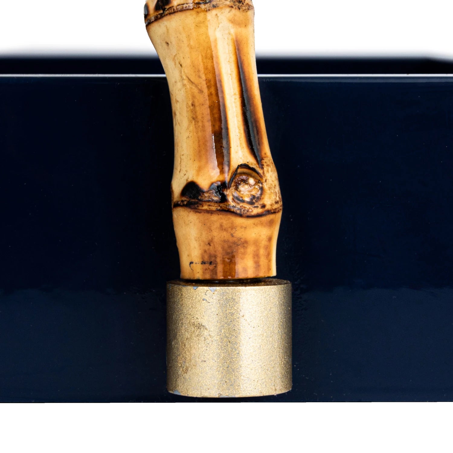 This Le Bleu in navy is a stylish homage to coastal living. Its rectangular silhouette and bamboo construction are accented with metal details, creating a piece that's both functional and decorative. The tray's generous size makes it perfect for serving guests at the seaside retreat or as a statement piece in any room that celebrates the coastal lifestyle. With its blend of natural materials and nautical color, it's a tray that serves up sophistication along with any favorite treats.