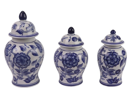 These gorgeous ginger jar canister sets are exactly what your kitchen needs! Offered in four stunning styles, they’re as beautiful as they are practical. Crafted to be food-safe, they’re perfect for keeping your kitchen organized in style. Whether used for dry goods or as a charming accent piece, these canisters make a fantastic gift idea. Blue and white floral design with three size options, offering both elegance and function.