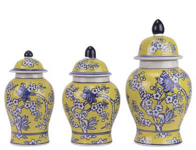 These gorgeous ginger jar canister sets are exactly what your kitchen needs! Offered in four stunning styles, they’re as beautiful as they are practical. Crafted to be food-safe, they’re perfect for keeping your kitchen organized in style. Whether used for dry goods or as a charming accent piece, these canisters make a fantastic gift idea. Yellow, blue, and white floral and bird design with three size options, offering both elegance and function.