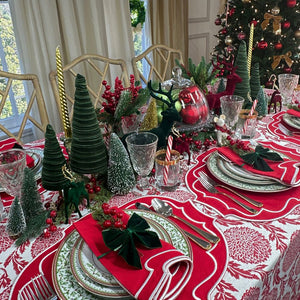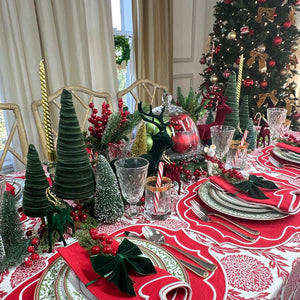 Belle napkins provide the foundation for memorable holiday meals. The red linen coordinates beautifully with traditional Christmas colors while the precise white embroidery adds sophisticated detail that guests notice and appreciate.
