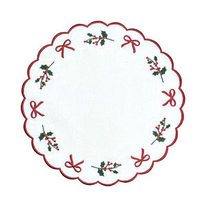 Make your table merry and bright with the premium linen, Studio Collection: Holly & Bows Placemat adorned with exquisite holiday embroidery.