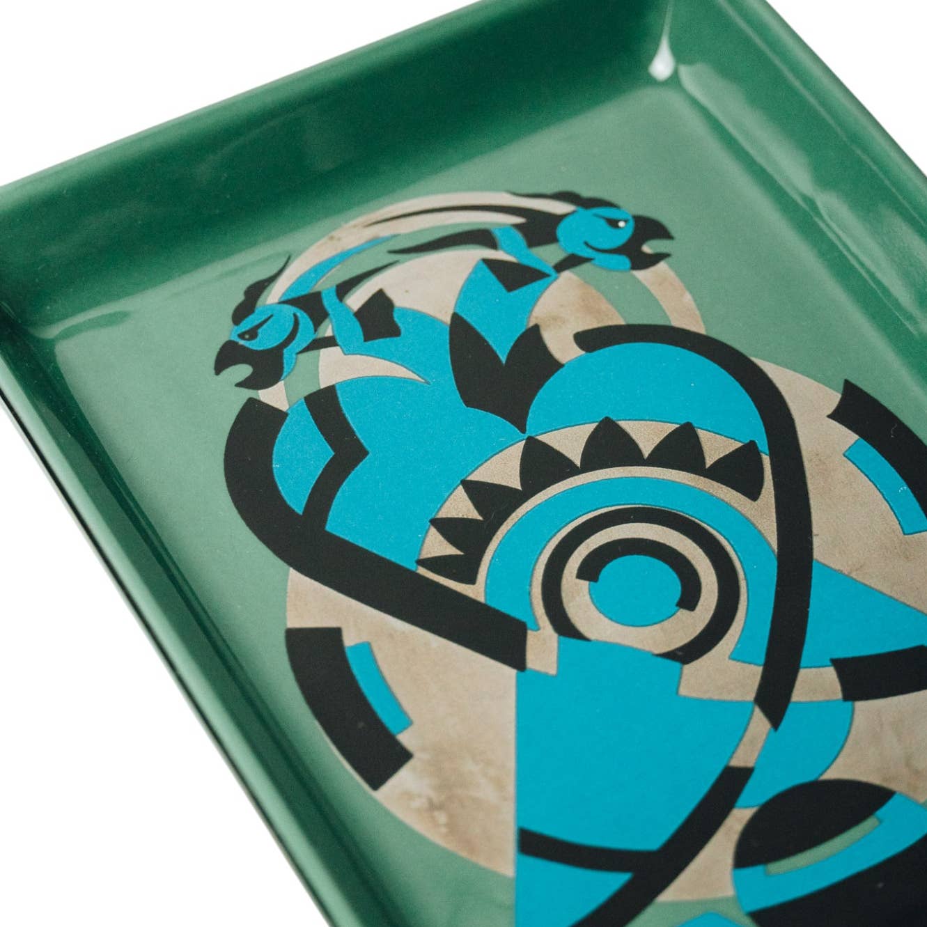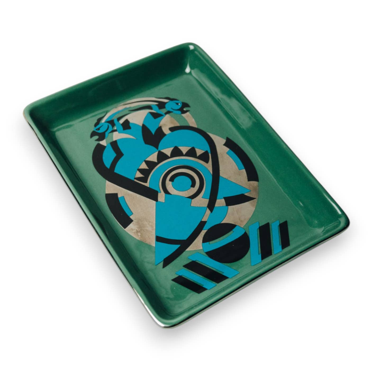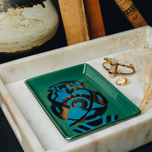 This striking 5" x 7" tray showcases an Art Deco-inspired stallion design in bold turquoise and black tones, accented with shimmering silver foil details. Set against a rich green background, the tray embodies strength and elegance through its geometric and symmetrical composition. Perfect for holding jewelry, keys, or other small treasures, the Deco Stallion Tray brings a touch of sophistication and modern artistry to any space.