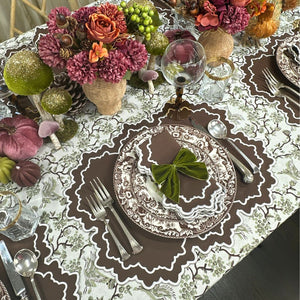 We're particularly drawn to the rich cocoa hue with its crisp white embroidery. It's the kind of color that works beautifully through the seasons—rich enough for autumn gatherings, and warm enough for winter dinners.