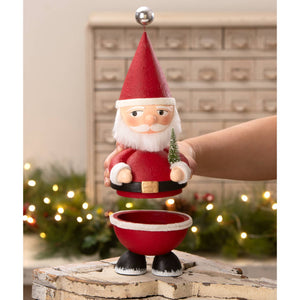 Bring retro charm to your holiday celebrations with our jingle bobble santa container! This delightful reproduction of a vintage santa container features classic details and playful design. Santa wears a tall red hat with a whimsical jingle bell at the tip, adding a touch of festive cheer. His real fabric beard brings an authentic feel, and in his hand, he holds a skinny bottle brush tree. Perfect for filling with small treats, candies, or simply displayed as a nostalgic centerpiece, this santa is a joyful addition to your holiday decor. Hand-painted resin, bottle brush, flocking, fabric, chenille, and plastic beads.
