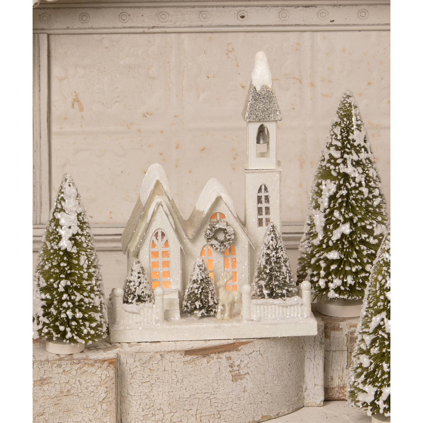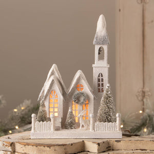 Create an inviting, wintery scene with this beautiful large sized putz church. Made of pressed paper with bottle brush trees covered in textured snow and glitter. Add a c7 light to create a warm glow. Bring the magic of christmas to life in your home with specialty holiday décor by bethany lowe designs. Light not included. Pressed paper, bottle brush trees, faux snow and glitter.