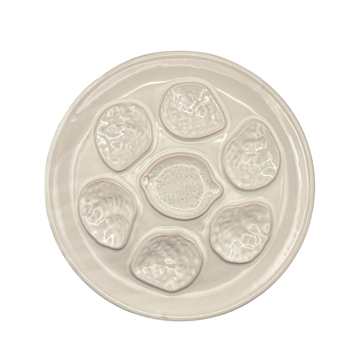 Gorgeous vintage Montmorency oyster plate with a whitewashed glaze over terracotta, resulting in a creamy, milky white appearance.