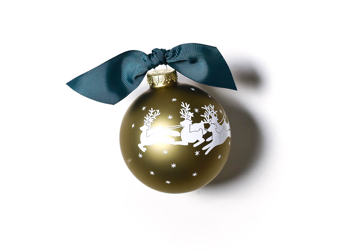 Flying high above the towns, Santa Claus sends his jolliest holiday wishes with the Merry Christmas to All Glass Ornament. Complete your seasonal décor with this red and gold bauble.