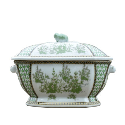 What a gorgeous centerpiece for a dining table or sideboard. I love the green foliage motif, paired with the green and white fish scale pattern. It's a stunning statement piece!