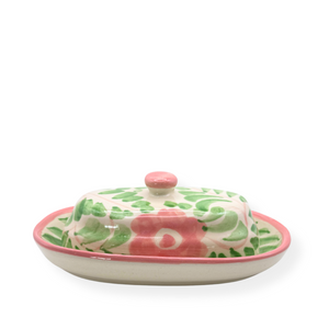 Our butter dishes are in two parts, and each one is handpainted with such care. The bottom plate is chic enough to also be used as a small serving piece with its all over pattern.