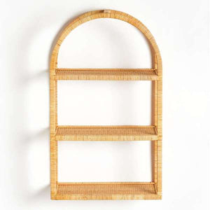 This 3-tier rattan wrapped curio shelf with an arch design is a casual accent for the home or office. A dynamic look alongside framed prints when styled with your favorite little accents, books and potted plants.
